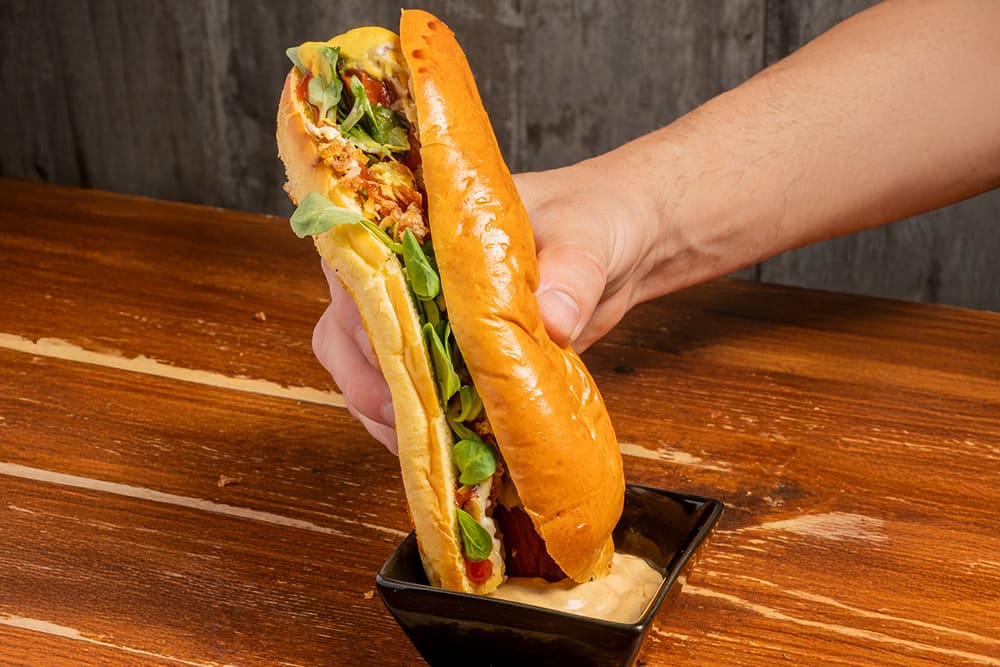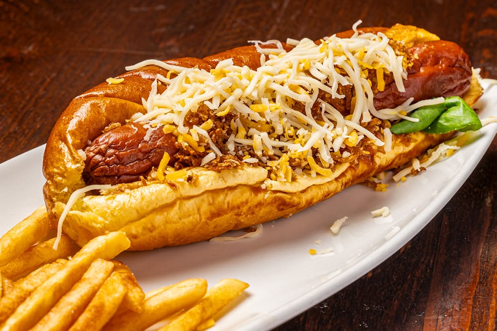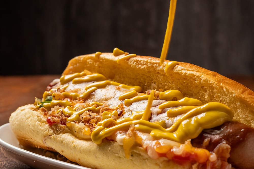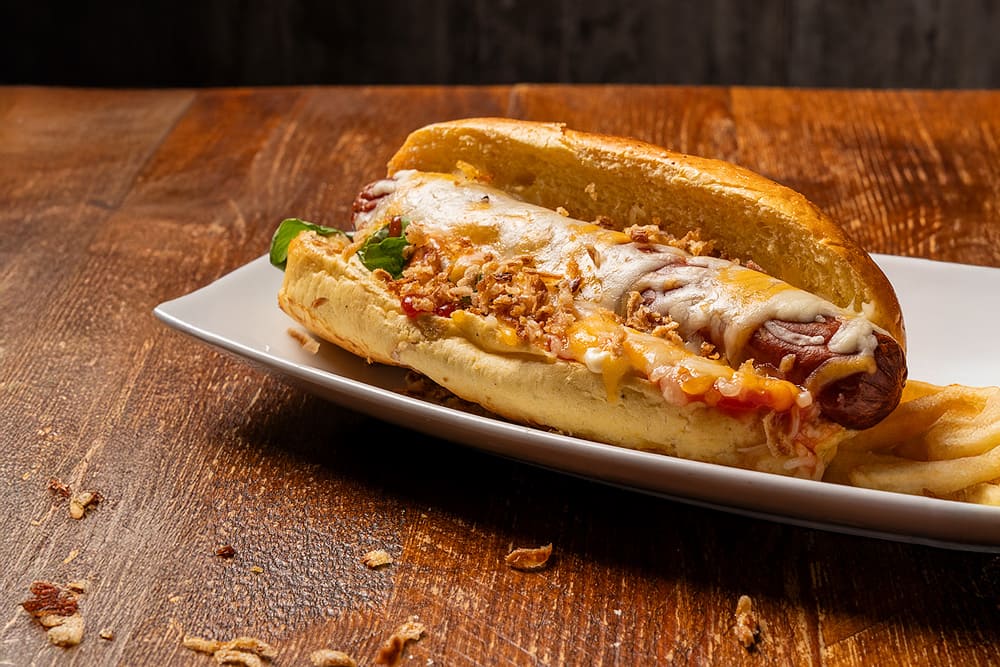 Salchica Franfurt orixinal, cebola fritida, canónigos , queixo, ketchup, maionesa e mostaza